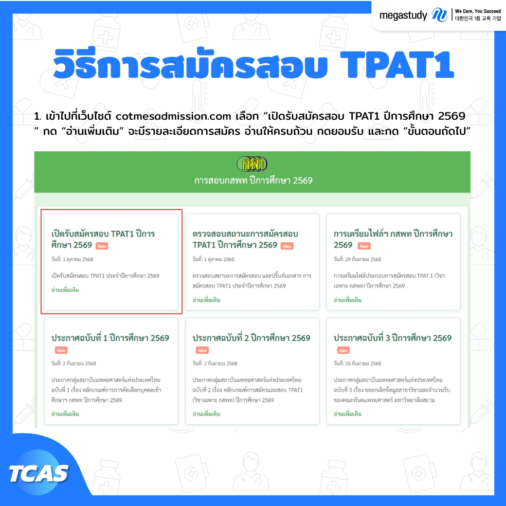 1. เข้าไปที่เว็บไซต์ cotmesadmission.com เลือก "เปิดรับสมัครสอบ TPAT1 ปีการศึกษา 2569” กด "อ่านเพิ่มเติม” จะมีรายละเอียดการสมัคร อ่านให้ครบถ้วน กดยอมรับ และกด "ขั้นตอนถัดไป”
