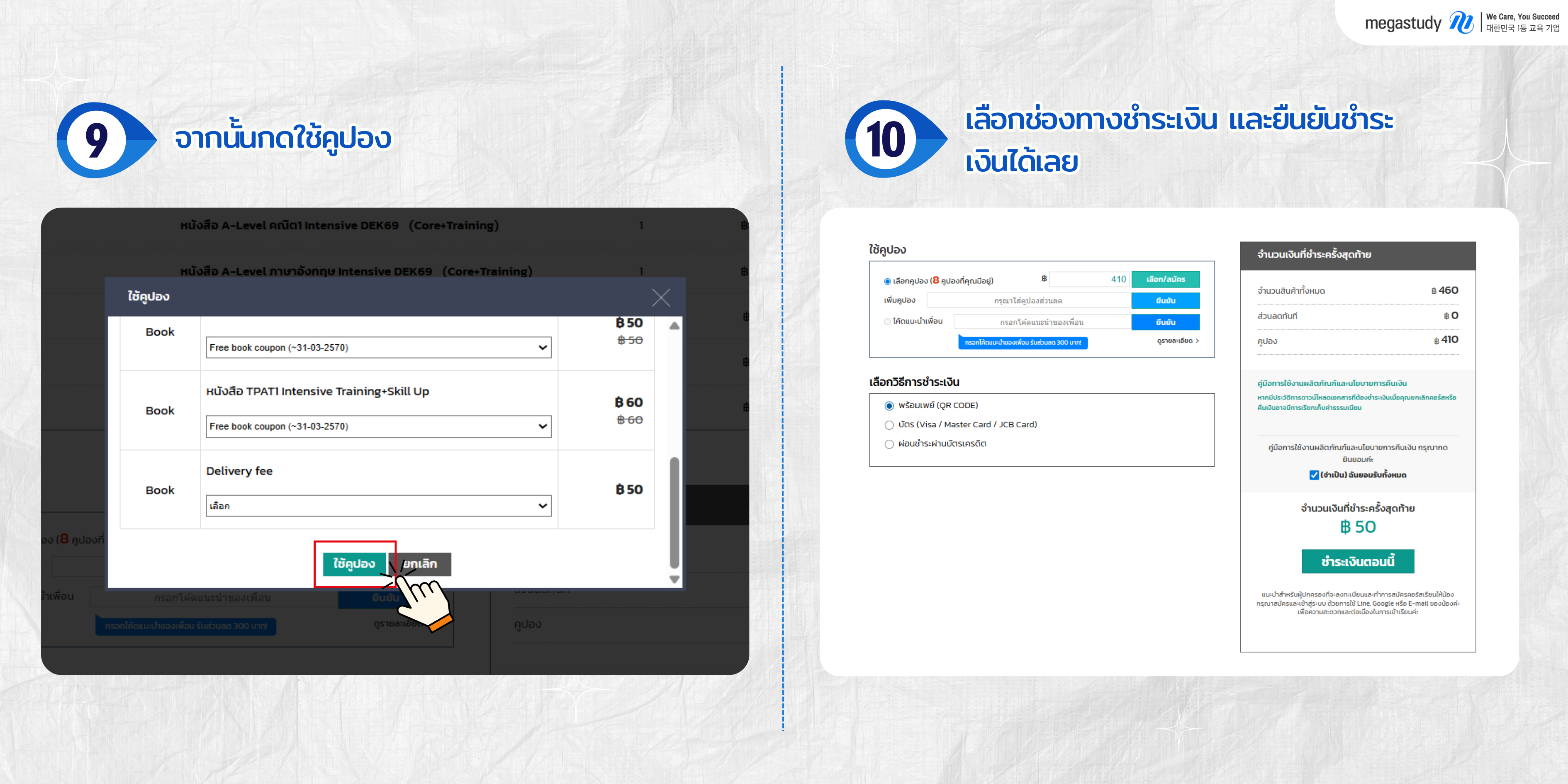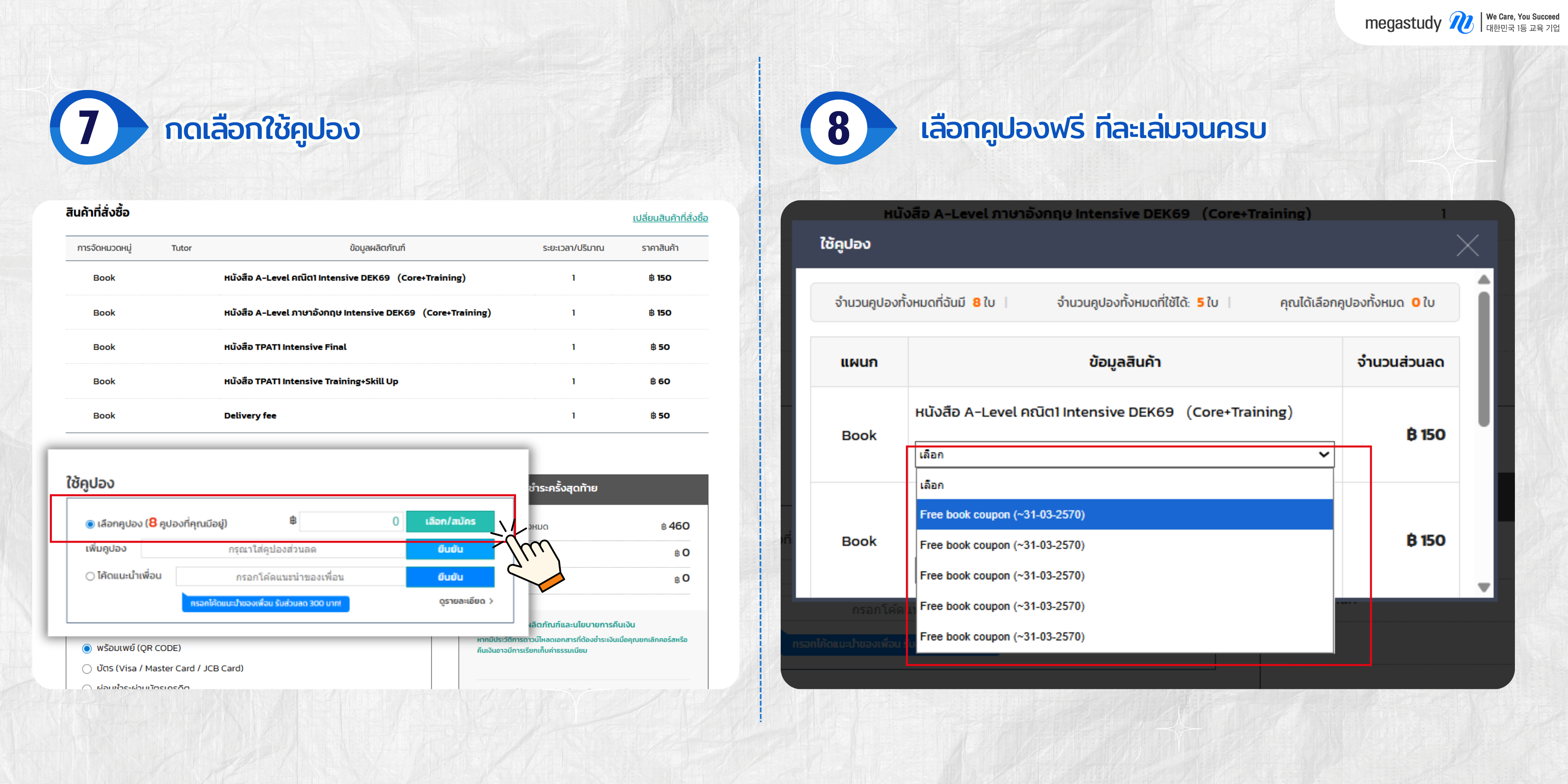 สำหรับน้อง ๆ ที่สมัครเรียนคอร์ส MEGAPASS และได้รับคูปองหนังสือฟรี สามารถใช้งานคูปองได้ตามขั้นตอนดังนี้ได้เลย เมื่อดำเนินการครบถ้วน ระบบจะจัดส่งหนังสือให้ตามลำดับ