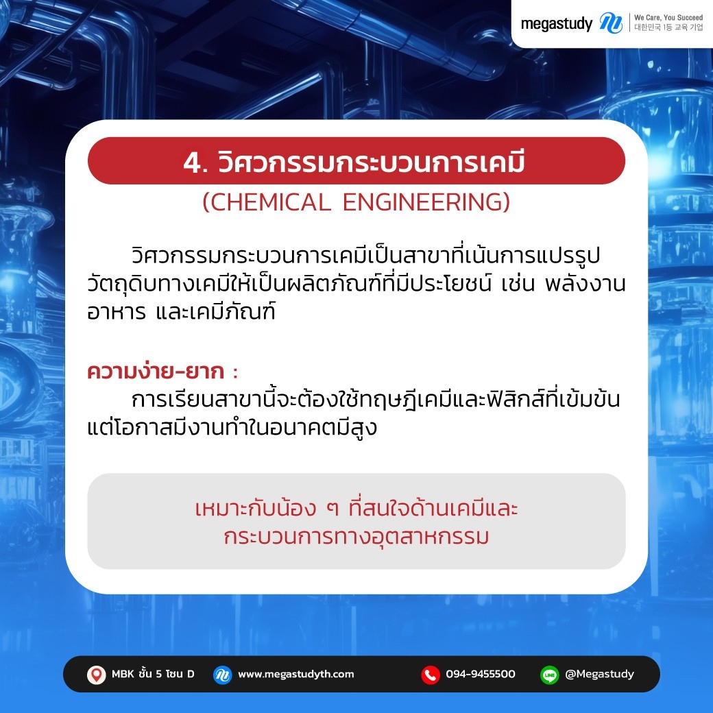 วิศวกรรมกระบวนการเคมีเป็นสาขาที่เน้นการแปรรูปวัตถุดิบทางเคมีให้เป็นผลิตภัณฑ์ที่มีประโยชน์ เช่น พลังงาน อาหาร และเคมีภัณฑ์ เหมาะกับน้อง ๆ ที่สนใจด้านเคมีและกระบวนการทางอุตสาหกรรม