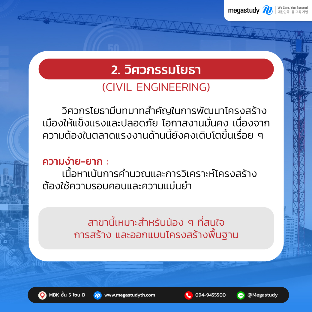 สาขานี้เหมาะสำหรับน้อง ๆ ที่สนใจการสร้างและออกแบบโครงสร้างพื้นฐาน เช่น อาคาร ถนน และสะพาน โดยวิศวกรโยธามีบทบาทสำคัญในการพัฒนาโครงสร้างเมืองให้แข็งแรงและปลอดภัย โอกาสงานมั่นคง เนื่องจากความต้องในตลาดแรงงานด้านนี้ยังคงเติบโตขึ้นเรื่อย ๆ