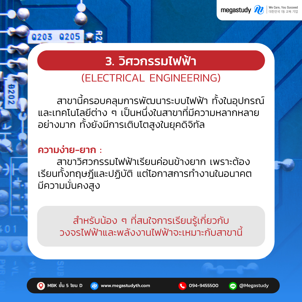 ความง่าย-ยาก : สาขาวิศวกรรมไฟฟ้าเรียนค่อนข้างยาก เพราะต้องเรียนทั้งทฤษฎีและปฏิบัติ แต่โอกาสการทำงานในอนาคตมีความมั่นคงสูง