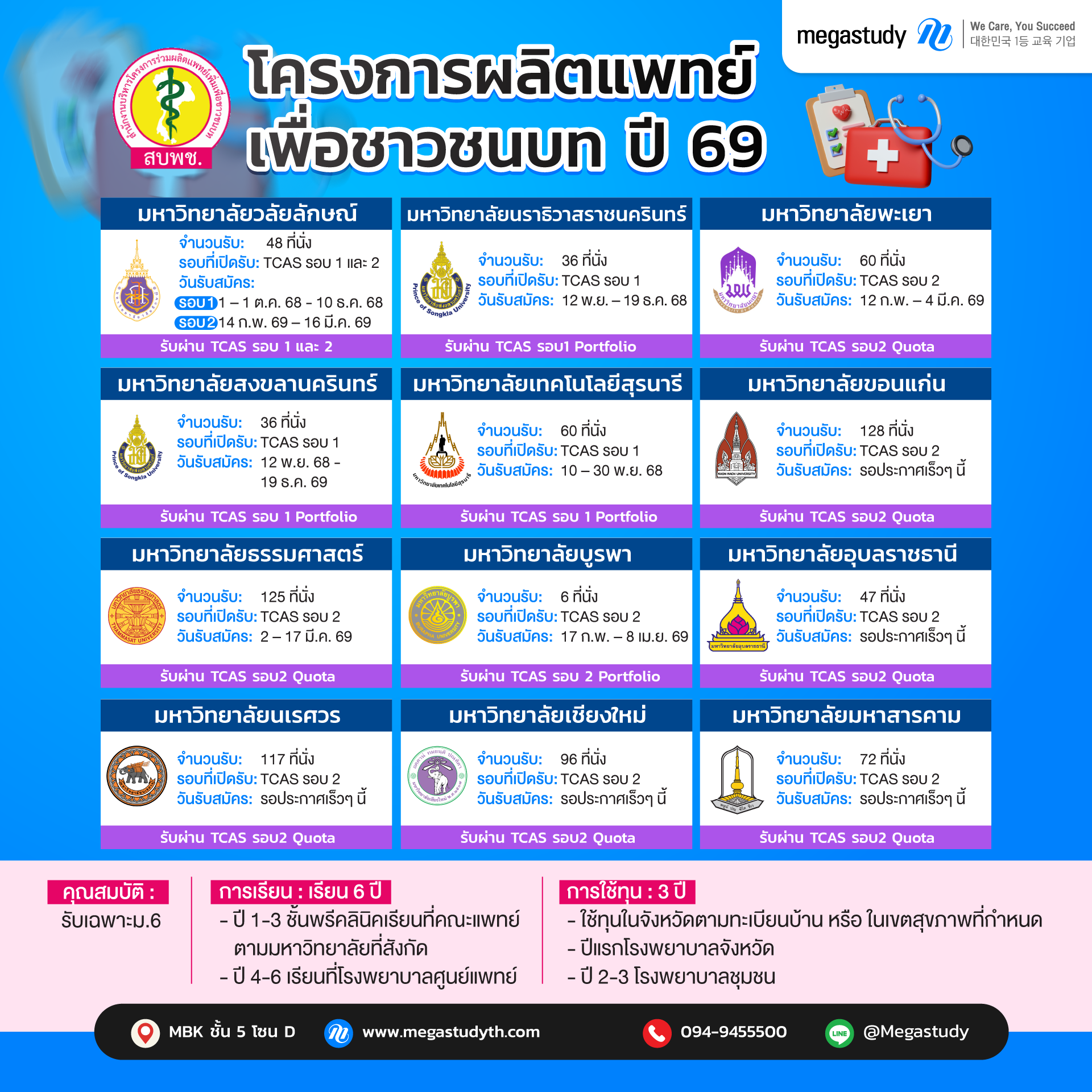 เป็นโครงการรับตรง/โควตาในระบบ TCAS69 รอบที่ 2 (Quota) สำหรับคณะ/หลักสูตรแพทยศาสตร์ที่มุ่งผลิตแพทย์เพื่อชุมชนและชนบท